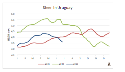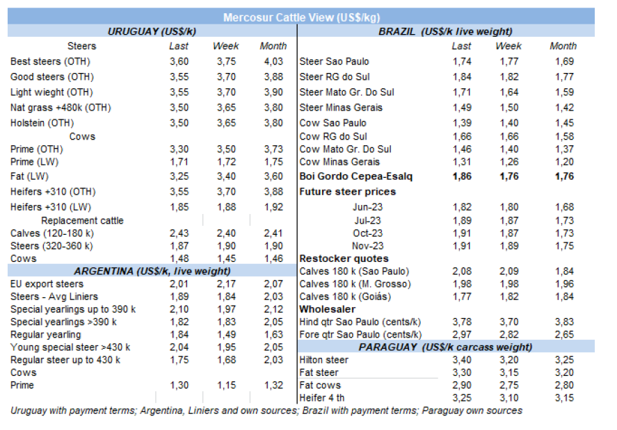 無(wú)論如何,阿根廷仍是該地區(qū)價(jià)格最高的國(guó)家,其次是烏拉圭,其價(jià)格趨勢(shì)也是向下的。本周的出口價(jià)格下降了15美分,為$3.60/公斤。