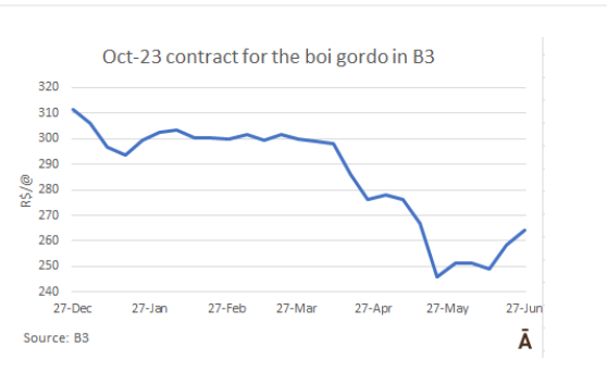 南馬托格羅索州和馬托格羅索州的上調(diào)幅度比較大,分別為R$10和R$5。在期貨市場(chǎng),10月23日boi gordo合約在經(jīng)歷了4月初和5月下半月的大幅下跌后正在恢復(fù),當(dāng)時(shí)它從R$300下跌到R$250(-18%)。從那時(shí)起,它已經(jīng)恢復(fù)了約R$18。達(dá)到R$264。與圣保羅價(jià)格相比,該合同的溢價(jià)超過(guò)R$20。