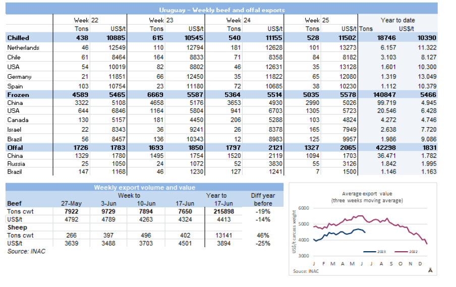 一位貿(mào)易商說(shuō)本周的出價(jià)比烏拉圭行業(yè)所宣稱的低20-30%。圓切$4800,牛腱子$5000或更低。雖然對(duì)骨頭的需求 "更加堅(jiān)定",但腿骨的出價(jià)為$1200,比行業(yè)預(yù)期的價(jià)格低約$600。烏拉圭牛霖$5000,牛腱子$5200,牛肋條$4800,肩胛背肩$3800,80碎肉$3000。