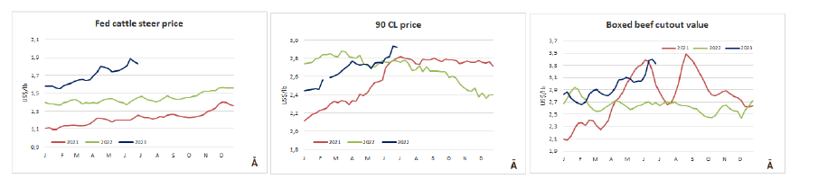 在過(guò)去的兩個(gè)月里,肥牛價(jià)格再次下跌。出口肥牛參考價(jià)格從4月底的$4.30/公斤下降到本周的$3.73/公斤,下降了13%。同時(shí),小牛的價(jià)格從$2.51/公斤降至$2.43/公斤,僅損失3%。