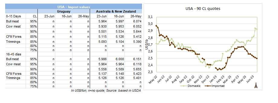 在7月4日的獨(dú)立日假期之前,本周美國(guó)進(jìn)口市場(chǎng)略顯平靜。澳大利亞大量出口肉類,占據(jù)市場(chǎng)主導(dǎo)地位。配額外的90牛前參考價(jià)格為$4000(CFR),95牛前的參考價(jià)格為$4200。