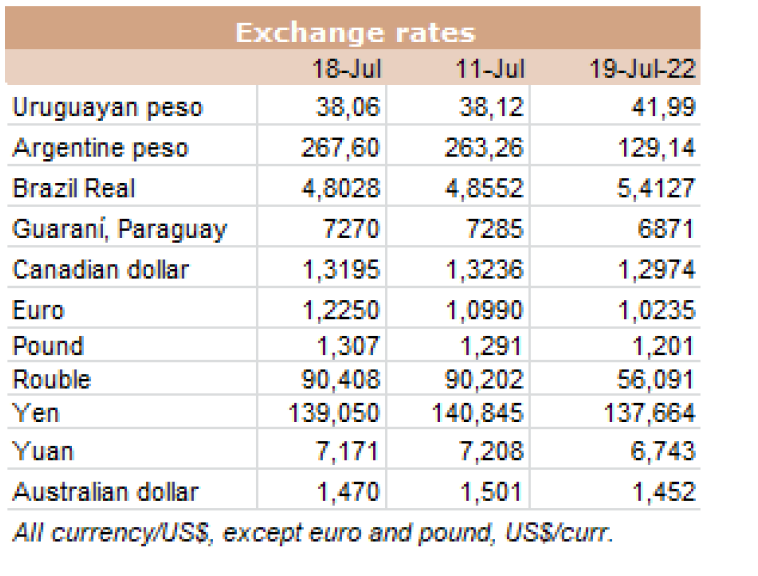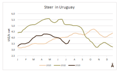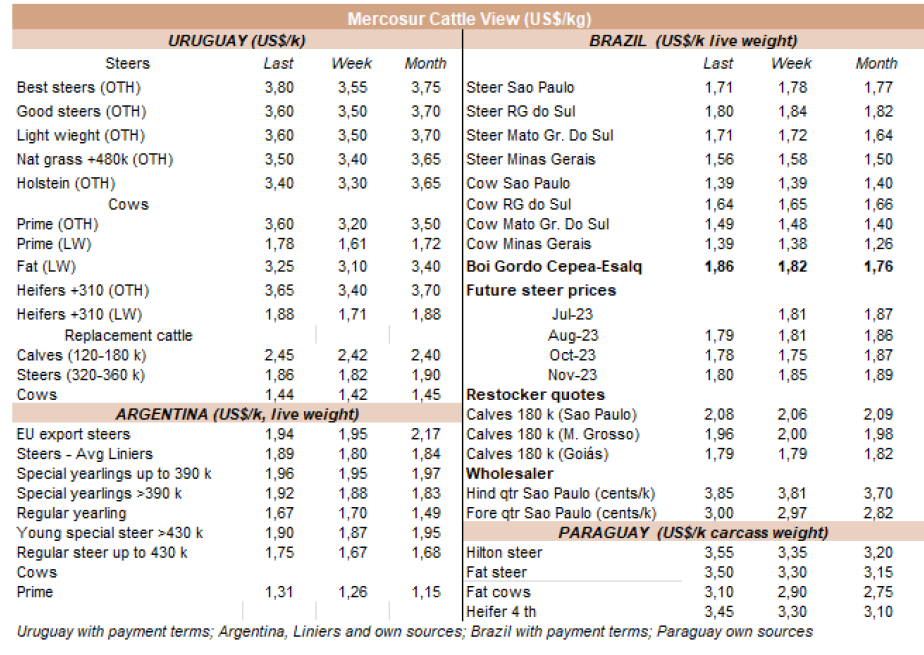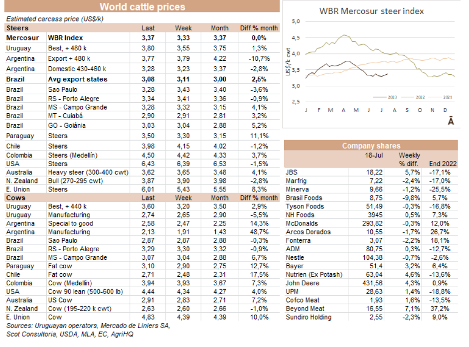 世界牛肉報(bào)告顯示過(guò)去一周南方共同市場(chǎng)閹牛價(jià)格上漲4美分至3.37美元/公斤。牛肉屠宰量增加,烏拉圭上漲了7%,巴拉圭上漲了6%,阿根廷市場(chǎng)保持穩(wěn)定,而巴西出口平均數(shù)減少了1%(-3美分)至每公斤3.08美元。雷亞爾對(duì)美元的升值(+1%)阻止了該地區(qū)牛價(jià)格的進(jìn)一步下跌。