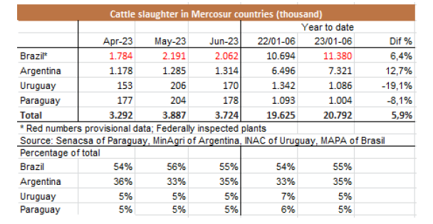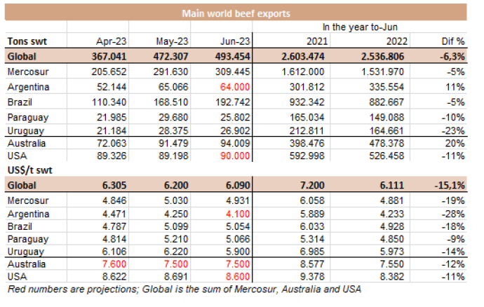 盡管國(guó)家統(tǒng)計(jì)和普查研究所(INDEC)的數(shù)據(jù)明天才能發(fā)布,根據(jù)SENASA衛(wèi)生服務(wù)局的數(shù)據(jù)估計(jì),6月份帶骨去骨牛肉出口量為64171噸,比5月份相比高1%。中國(guó)的出口量有所下降,盡管其出口額在2023年仍然是迄今為止的第二高,超過(guò)50200噸。與此同時(shí),與2022/23年關(guān)稅配額的關(guān)閉一致,對(duì)歐盟的出口量有所下降。與此同時(shí),以色列的出口量有所恢復(fù),出貨量近4300噸,比上月增加183%。對(duì)智利和美國(guó)的出口也大幅增長(zhǎng),與上月相比分別增長(zhǎng)了44%和32%