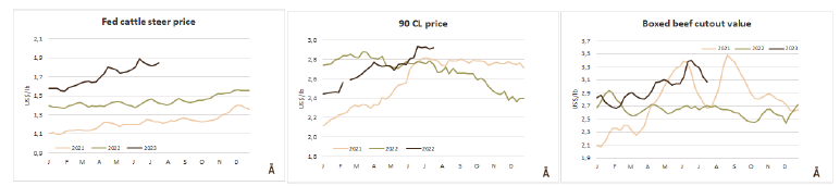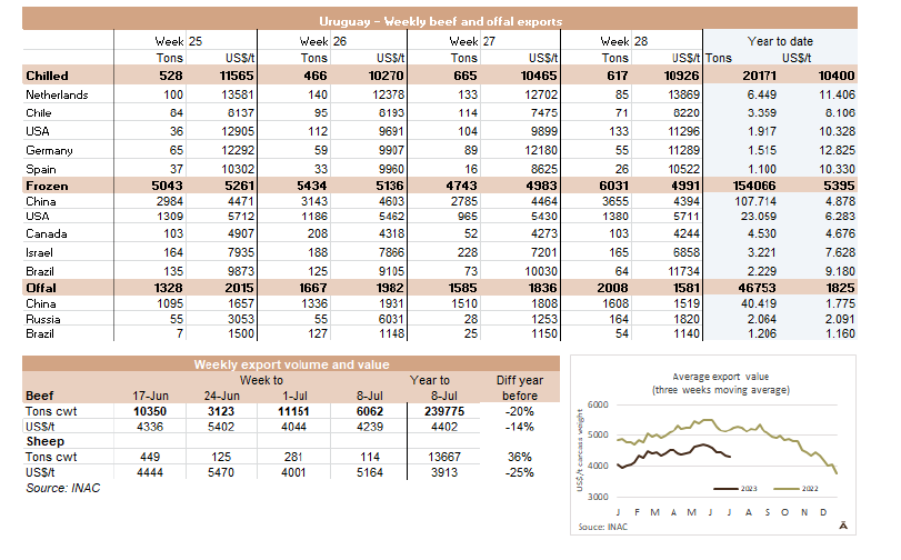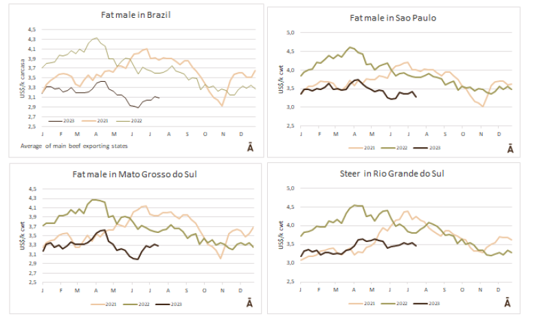 根據(jù)巴西環(huán)境與分析研究所上周發(fā)布的數(shù)據(jù)顯示,由于季節(jié)性調(diào)整,5月份的零售額比4月收縮了1%。與2022年5月相比,零售額也下降了1%,遠(yuǎn)低于分析專家關(guān)于1.6%復(fù)蘇的預(yù)期。預(yù)計(jì)7月份出口量將低于16萬(wàn)噸。上周牛肉出口達(dá)到3.925萬(wàn)噸,周增長(zhǎng)5.01%。7月前十個(gè)工作日,牛肉出口約7.663萬(wàn)噸,平均0.766萬(wàn)噸/天,比2022年7月的日均水平低3.72%。Agrifatto稱:“通常情況下,前兩周的出貨量是最大的,7月迄今為止的統(tǒng)計(jì)數(shù)字表明,本月16萬(wàn)噸的出口預(yù)期很難完成。