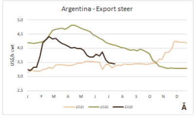 據(jù)INAC報(bào)道,6月份公牛2.0的價(jià)格為1497美元/噸,比5月份的 1610美元/噸降低了7%。肉類價(jià)格的下將的原因是出口產(chǎn)品、國(guó)內(nèi)市場(chǎng)的胴體、以及內(nèi)臟和副產(chǎn)品的價(jià)格的下降