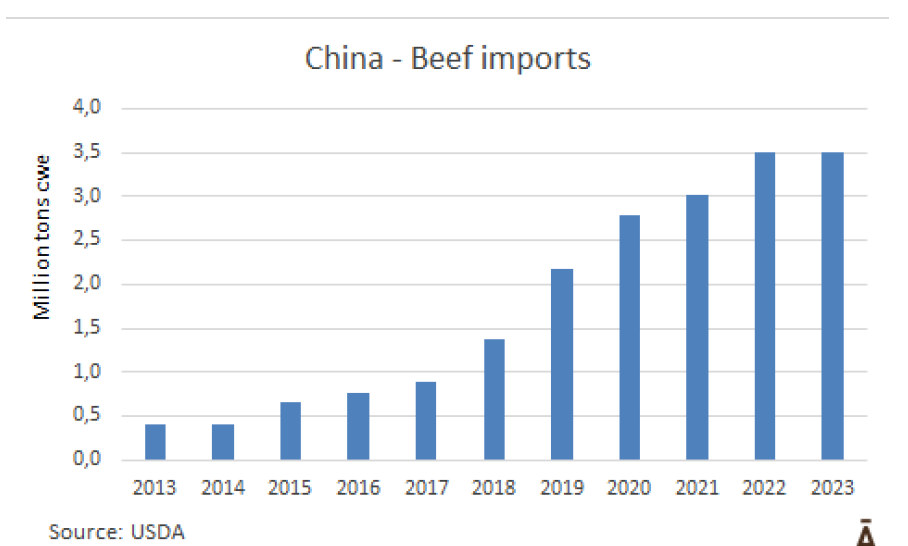 盡管中國(guó)正在經(jīng)歷經(jīng)濟(jì)困難,但美國(guó)農(nóng)業(yè)部(USDA)仍將今年牛肉進(jìn)口預(yù)期維持在350萬(wàn)噸,與2022年持平。