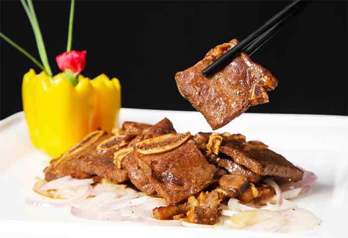 牛仔骨重要的附加價值就在于“帶骨”“有骨氣”,帶骨煎制或烤制,肉香更為濃郁,加上我們是喜歡啃硬骨頭的。比如“帶骨牛小排Karubi”烤肉,這款烤肉需要肉與骨一起切,可在其冷凍狀態(tài)時鋸成想要的厚度。韓式烤肉中就常有帶骨Karubi,一般將牛仔骨的三支骨頭沿垂直方向切成骨長約4厘米,大小片切時約8厘米的平板狀。切成扁平狀時,為使頭尾的切口處平整,需把肉切薄,去除肉片表面附著的殘骨。注意不要將附著在骨頭周圍的霜降大理石紋精肉與骨頭分離,小心地沿著肉骨交接處劃下約5毫米深的刀痕,可使醬料沿著刀痕充分滲入整塊肉,這是韓式烤肉的美味秘訣。在宴會菜單或什錦拼盤中加入牛仔骨,會令人覺得十分豪華。特別是長8厘米的大片牛仔骨占滿整個烤肉網的擺法,不禁令人贊嘆,價值感滿滿。