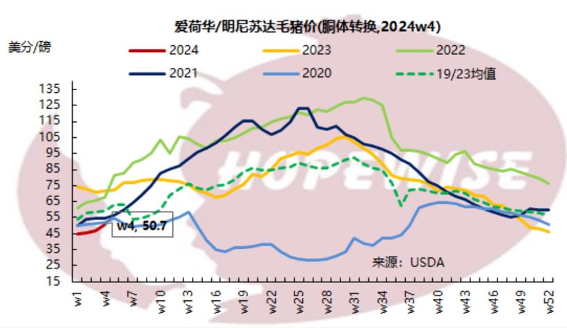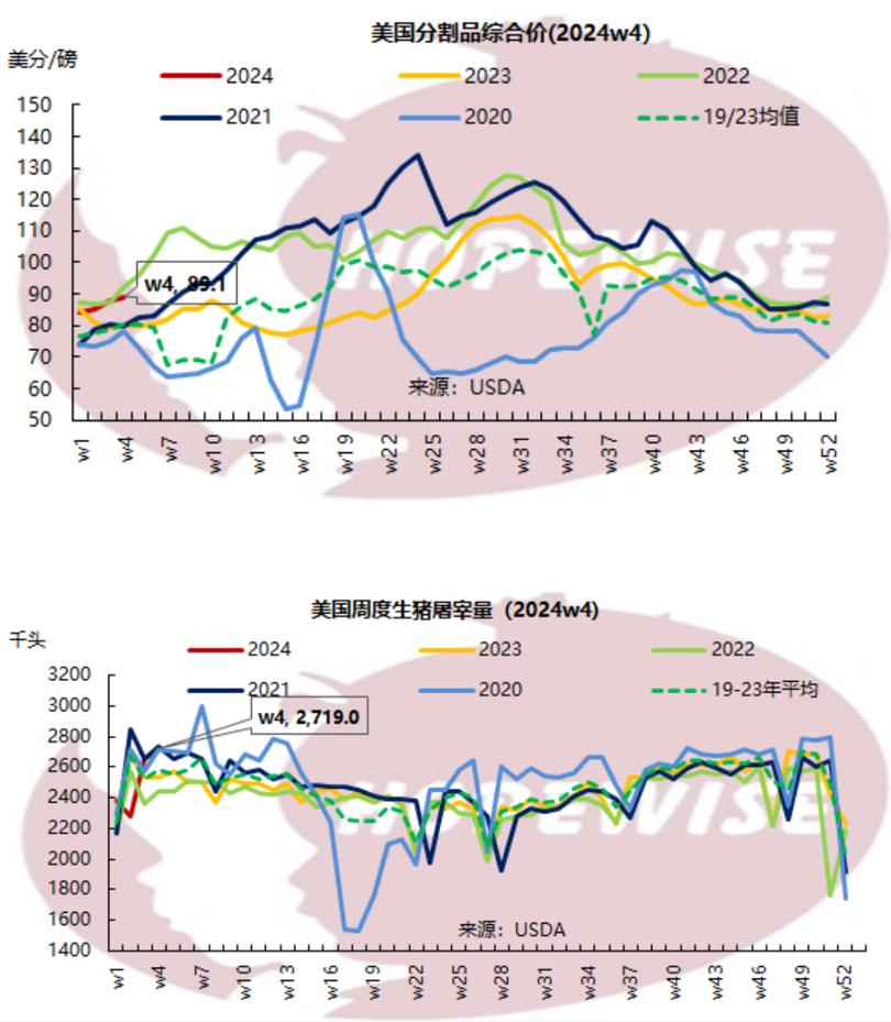2024 年第 4 周活豬價格為 14.24 元/公斤,與上周相比上漲 3.9%,但與去年同期相比下跌 7.59%。胴體價格為 19.29 元/公斤,與上周相比上漲 4.3%,但與去年同期相比下跌 8.7%。受新一輪雨雪天氣影響,南方市場的運輸受到一定阻礙。本周初,全國豬肉價格上漲超過 14.5 元/公斤。然而,豬價上漲后,終端客戶的后續(xù)需求疲軟。市場對未來上漲的預(yù)期減弱,導(dǎo)致養(yǎng)豬積極性下降。臨近周末,豬肉價格再次出現(xiàn)窄幅調(diào)整。