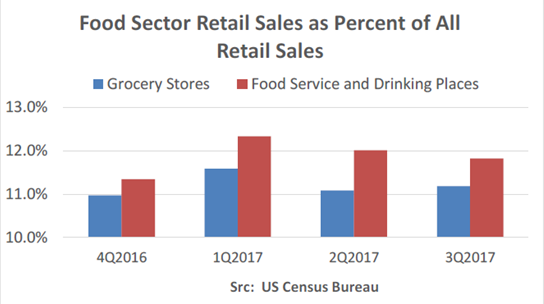 2008-2009年經(jīng)濟大衰退以來,牛肉需求的艱難表現(xiàn)使零售銷售在食品行業(yè)增長節(jié)奏非常之緩慢。11月的零售店銷售額較上年同期增長了3.4%,但由于今年頭兩個月和六月與七月的增長乏力,今年的銷售額可能不會超過1.5%。餐飲服務(wù)零售增長趨勢敲響了更重的警鐘。 11月餐飲服務(wù)的銷售增長同比只有2.5%,10月只有1.5%。和2015年的8%2016年的6%的增長相比,2017年,餐飲服務(wù)銷售較去年增長只有2.3%