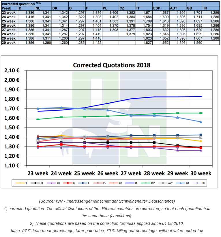 德國的豬價也面臨壓力,豬價下跌3歐分,據(jù)稱是由于假日肉類交易疲軟導(dǎo)致的。德國屠宰量已經(jīng)低于900,000頭,較去年下降很明顯。歐洲南部地區(qū)豬價沒有明顯下降,意大利和西班牙假期需求增加。