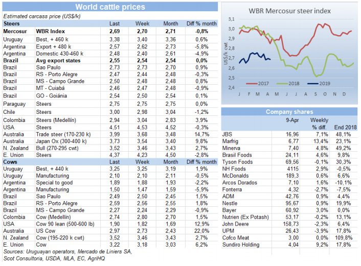 出口閹牛價格穩(wěn)定,最好的英國種閹牛106-116雷亞爾/公斤,印度串種牛小幅降低1-2雷亞爾到102-108雷亞爾,良種母牛上漲2雷亞爾到89-92雷亞爾。