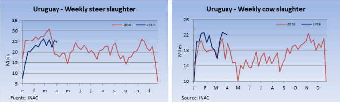 三月出口歐盟冷鮮市場牛肉價格持續(xù)下行趨勢,均價6935美金,2009年9月以來新低,自2018年6月,也就是九個月以來跌了25%,同時出口量也急劇減少,第一季度只出口3751噸,同比減少28%。因為歐洲市場價格劇跌,相比巴西國內(nèi)市場已經(jīng)沒什么優(yōu)勢,所以巴西工廠沒有太多意愿出口,尤其歐盟對可追溯性要求還很嚴。