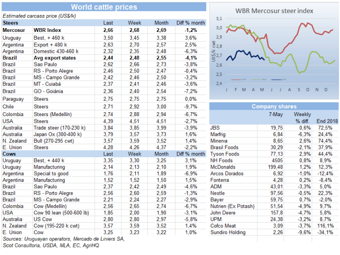 中美貿(mào)易戰(zhàn)升級(jí)影響了南美各國貨幣匯率,拉低了美金牛價(jià),本周南方共同市場(chǎng)閹牛指數(shù)跌了2美分到2.66美金/公斤,在特朗普發(fā)推威脅加征關(guān)稅之后,阿根廷比索和巴西雷亞爾都有貶值,比索貶值4.2%,雷亞爾貶值1.6%,因此巴西育肥牛跌了4美分到2.44美金,阿根廷閹牛跌了7美分到2.63美金,烏拉圭活牛進(jìn)一步短缺,價(jià)格再度上漲,達(dá)到3.5美金,巴拉圭牛價(jià)連續(xù)三周不變,保持在2.75美金。