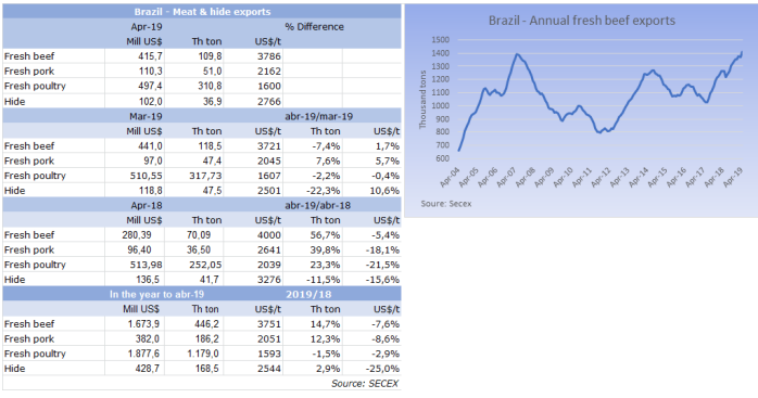 截止到四月的12個(gè)月內(nèi),巴西共出口141萬噸牛肉,創(chuàng)下了12年前2007年五月創(chuàng)下的139萬噸的記錄。四月巴西出口了109804噸牛肉,均價(jià)3786美金離岸價(jià),雖然量比三月底,但遠(yuǎn)超去年四月,去年五六月由于運(yùn)輸罷工,出口量很低,所以今年五六月份有望繼續(xù)突破連續(xù)12個(gè)月的出口量記錄。目前巴西已經(jīng)連續(xù)十個(gè)月出口量超過10萬噸。