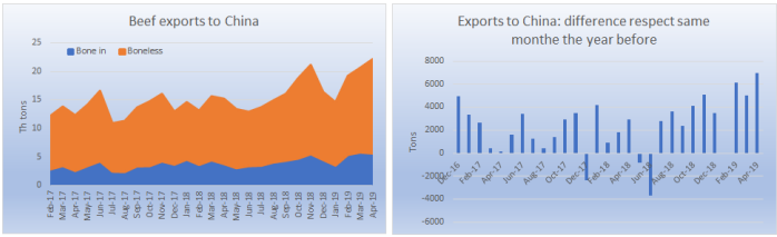 四月烏拉圭牛肉出口量32402噸,其中22165噸去中國,占比68.4%,新歷史紀(jì)錄,其中2644噸冷鮮和29758噸冷凍牛肉,均價(jià)分別為9047和4680美金/噸,出口中國的量同比增加46%,今年前四個(gè)月中國分別進(jìn)口了20378噸帶骨和56283噸去骨牛肉,同比分別增加23%和33%。美國市場(chǎng)也很活躍,年初價(jià)格漲了很多,四月共進(jìn)口3796噸牛肉,今年前四個(gè)月進(jìn)口12731噸,同比增加16%。