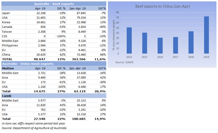 2019年前四個(gè)月澳洲對(duì)中國出口72460噸牛肉,同比增加66%,至此中國成為澳洲牛肉第三大市場(chǎng),接近美國7.96萬噸和日本8.78萬噸。四月澳洲共出口98647噸牛肉,連續(xù)16個(gè)月同比增加,前四個(gè)月共出口36.3萬噸,同比增加11.6%。前四個(gè)月綿羊肉出口量也增長(zhǎng)了20%,達(dá)到63119噸,羊羔肉出口增長(zhǎng)15%到100685噸。