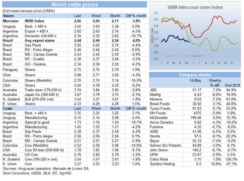 Marfrig的CEO稱,出口中國市場價格上漲,有助于支撐烏拉圭活牛價格,但工廠利潤空間還是不大。因為兩大因素活牛市場很難達到平衡,第一育肥牛供應(yīng)量很少,第二冬天即將來臨,冬天供應(yīng)量正常會下降。中國非洲豬瘟的惡化催生了很多的投機者,但Marfrig的策略還是照顧長期客戶,即使這樣沒法賣出最高的價格。