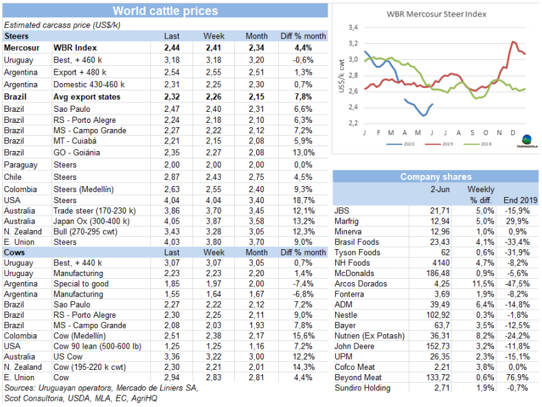 盡管美國疫情嚴(yán)重,美國市場仍有需求。據(jù)透露,阿根廷90CL牛前成交價5100美元/噸離岸價。烏拉圭方面主要的障礙是配額不足。事實上,上周烏拉圭向美國出口牛肉1023噸,這一速度是不可持續(xù)的,因為關(guān)稅優(yōu)惠的配額是2萬噸。今年烏拉圭的總出口量已達7179噸,比去年同期增長9.5%