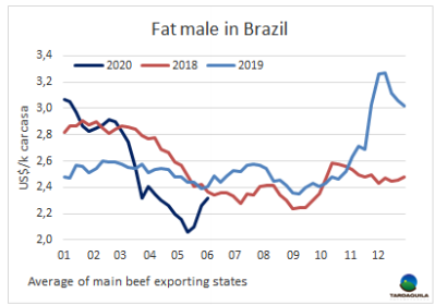 上周育成牛價格保持相對穩(wěn)定,保持五月價格走勢。巴西主要牛產(chǎn)區(qū),包括圣保羅、米納斯吉拉斯、馬托格羅索州期貨時限均保持在7-8天。在價格件套的基礎(chǔ)上,本周圣保羅育成牛價格上漲1雷亞爾/15公斤,上漲至193雷亞爾/15公斤,30天內(nèi)付款。隆多尼亞州活牛參考價也有上漲,上漲2雷亞爾至184雷亞爾/15公斤。其他地區(qū)價格保持不變。生產(chǎn)者仍然有大量的飼料,這使他們能夠保持放牧。隨著季節(jié)的變化,牧場在6月份狀況會惡化,這肯定會對育成牛價格造成負面影響。受新冠肺炎疫情影響,國內(nèi)市場需求依然偏謹(jǐn)慎。市場報告顯示,上周末的需求表現(xiàn)良好,批發(fā)市場價格保持穩(wěn)定。
