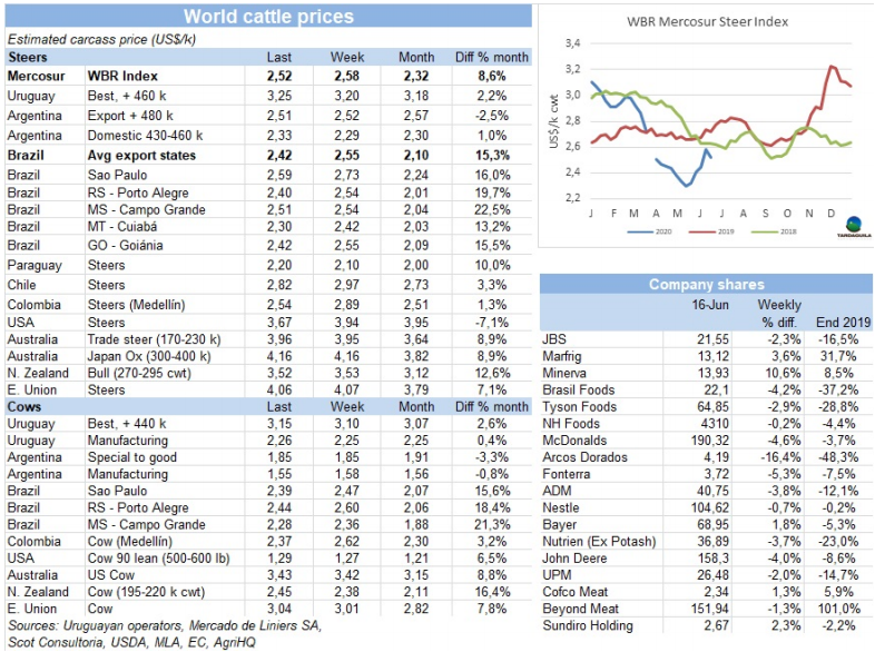 屠宰旺季和歐洲481配額的生產(chǎn)已經(jīng)過去,上周二,Marfrig停止了圣何塞的Inaler廠的屠宰活動。知情人士透露,由于牛只供應緊缺,而且中國市場正在對到港的所有集裝箱進行新冠病毒檢測,Marfrig集團正在研究關(guān)閉北部地區(qū)的工廠:Tacuarembo和Cledinor。Marfrig通常會在育成牛供應較少的冬季間歇關(guān)閉工廠,給員工放假。