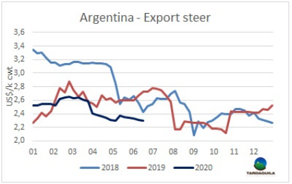 盡管猶太屠宰重新開始可能將在長周末之后助推閹牛價格,閹牛價格并沒有變化,育成公牛和母牛均保持與上周相同的參考價,最好的英國純種閹牛保持155-160比索/公斤,印度串種閹牛保持150-156比索/公斤,特優(yōu)種母牛138-142比索/公斤,為中國市場準備的工業(yè)母牛成交價115-120比索/公斤。