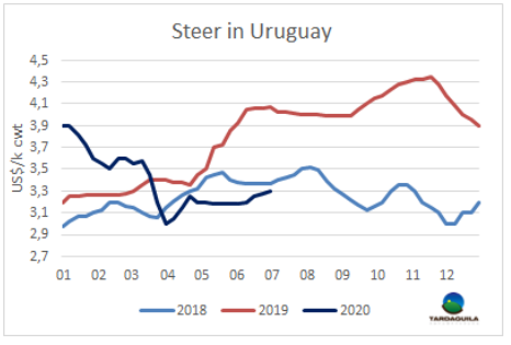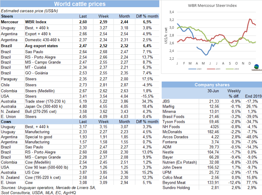 本周南方共同市場(chǎng)閹牛平均價(jià)格覆蓋了巴西貨幣疲軟帶來(lái)的價(jià)格下行。受疫情擴(kuò)散帶來(lái)的擔(dān)憂影響,巴西貨幣兌美元匯率下跌6.1%。盡管巴西育成牛平均價(jià)格上漲8雷亞爾/15公斤,上漲至202.8雷亞爾/15公斤,其美元價(jià)格下跌了5美分,下跌至2.47美元/公斤。南美地區(qū)其他國(guó)家育成牛價(jià)格均上行,尤其在阿根廷,活牛供應(yīng)短缺以及冰鮮產(chǎn)品到歐洲的出口價(jià)格拉動(dòng)出口閹牛價(jià)格上漲10比索/公斤。美元價(jià)格達(dá)到2.35美元/公斤。烏拉圭方面供應(yīng)短缺導(dǎo)致活牛參考價(jià)上漲3美分,上漲至3.3美元/公斤。WBR南方市場(chǎng)閹牛價(jià)格指數(shù)上漲1美分,至2.6美元/公斤。
