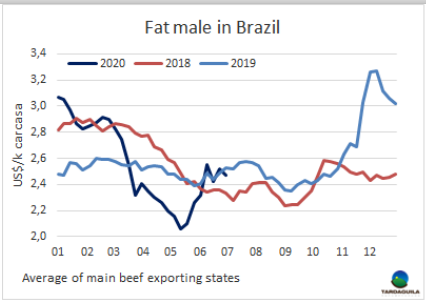 上周巴西主要牛產(chǎn)區(qū)育成牛價(jià)格強(qiáng)勁上漲,圣保羅州上周五活牛價(jià)格指數(shù)達(dá)218.35雷亞爾/15公斤,較前一周成交價(jià)上漲8雷亞爾/15公斤。本周價(jià)格增長(zhǎng)最明顯的地區(qū)戈亞尼亞(上漲10雷亞爾至207雷亞爾/15公斤),圣保羅(上漲了9.5雷亞爾,上漲至216.5雷亞爾/15公斤)30天內(nèi)付款。圣保羅做出口業(yè)務(wù)的工廠出價(jià)高達(dá)220雷亞爾/15公斤。那些做國(guó)內(nèi)屠宰的工廠出價(jià)低5-10雷亞爾/15公斤。供需雙方都比較樂(lè)觀,由于價(jià)格預(yù)計(jì)將繼續(xù)上漲,牛只供應(yīng)不足,牧草條件依然良好,生產(chǎn)者可以壓欄,價(jià)格預(yù)期繼續(xù)上漲。期貨預(yù)訂時(shí)間很短,從4天到5天不等。從需求端看,庫(kù)存很低,而且接近月初,人們預(yù)計(jì)銷(xiāo)售情況會(huì)好轉(zhuǎn)。此外,7月6日起圣保羅酒吧和餐館的可能重新開(kāi)放,也為市場(chǎng)帶來(lái)積極的氣氛。
