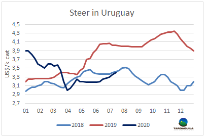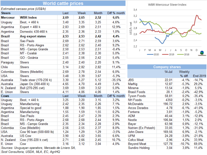 巴西屠宰活動(dòng)穩(wěn)定,阿根廷成為南方共同市場(chǎng)閹牛平均價(jià)格上漲的主要推手。本周南方共同市場(chǎng)閹牛價(jià)格指數(shù)上漲4美分,上漲至2.69美元/公斤。隨著歐洲冰鮮牛肉產(chǎn)品價(jià)格上漲,本周阿根廷閹牛出口價(jià)格上漲10比索/公斤,美元價(jià)格,加上9%的出口稅,達(dá)2.83美元/公斤,一周內(nèi)上漲14美分。烏拉圭牛價(jià)上漲5美分/公斤,上漲至3.4美元/公斤。巴西和巴拉圭活牛參考價(jià)保持穩(wěn)定,分別為2.53美元/公斤和2.4美元/公斤。