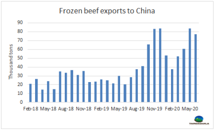 六月巴西對(duì)中國(guó)主港和香港出口量占冷凍牛肉出口總量的68%
