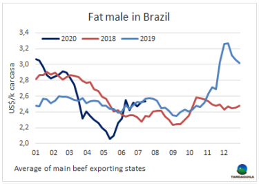美國(guó)農(nóng)業(yè)部表示,由于巴西、中國(guó)和北美的屠宰量低于預(yù)期,2020年的全球產(chǎn)量預(yù)測(cè)比之前的預(yù)測(cè)下調(diào)了1%。暫時(shí)的生產(chǎn)中斷導(dǎo)致加拿大和美國(guó)的產(chǎn)量預(yù)期下調(diào),而面對(duì)激烈的進(jìn)口競(jìng)爭(zhēng),中國(guó)牛肉產(chǎn)量的同比增幅也有所下調(diào)。同時(shí),巴西國(guó)內(nèi)牛肉需求低迷,牛價(jià)下跌,導(dǎo)致生產(chǎn)者推遲屠宰。