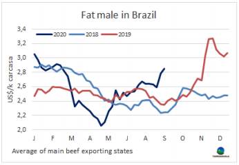 供應(yīng)短缺繼續(xù)籠罩活牛市場(chǎng),因此本周牛價(jià)再次上漲,昨天巴西主要出口州育成牛價(jià)格上漲至229.4雷亞爾/15公斤,較四月下半月開始上漲時(shí)上漲了27%。除圣保羅以外的地區(qū)預(yù)定期限都很短,大約在六天。批發(fā)市場(chǎng)后部位肉價(jià)格繼續(xù)上漲,前部位肉可能由于出口到中東市場(chǎng)有困難,價(jià)格稍有平衡。