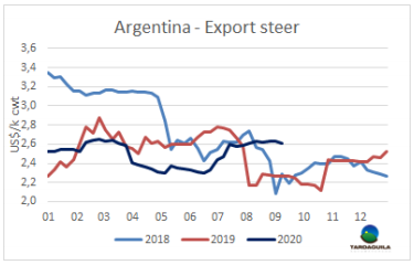 用于出口的牛價(jià)格已經(jīng)恢復(fù)了元?dú)猓贿^由于以色列假期和歐洲需求的下降,預(yù)計(jì)牛價(jià)將會(huì)下降。最好的英國純種閹牛成交價(jià)191-196比索/公斤,印度串種閹牛186-190比索/公斤,特優(yōu)種母牛158-163比索,工業(yè)母牛價(jià)格在136-143比索/公斤。