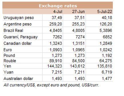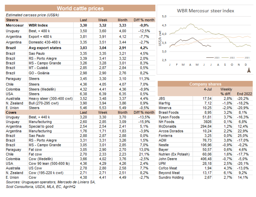 巴西,以雷亞爾計(jì)算的價(jià)格的小幅回升被匯率的下降所逆轉(zhuǎn)。主要出口國(guó)的肥牛下跌1美分,至每公斤3.03美元,仍然是該地區(qū)的最低參考價(jià)格。