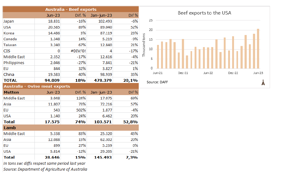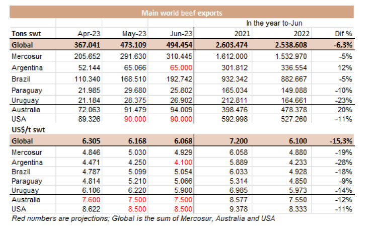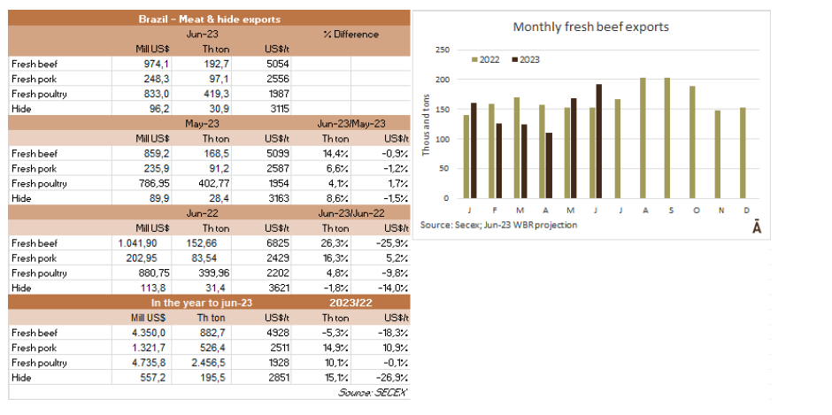在經(jīng)歷了低于去年的2-4月之后(受2月底發(fā)現(xiàn)的非典型瘋牛病病例的影響)巴西牛肉出口在6月份連續(xù)第二個(gè)月上升。對(duì)外貿(mào)易部報(bào)告說(shuō),共出口了192,742噸牛肉,比5月份多24,000噸,比2022年同月多40,000噸。平均價(jià)值為5054美元/噸,每月下降0.9%。