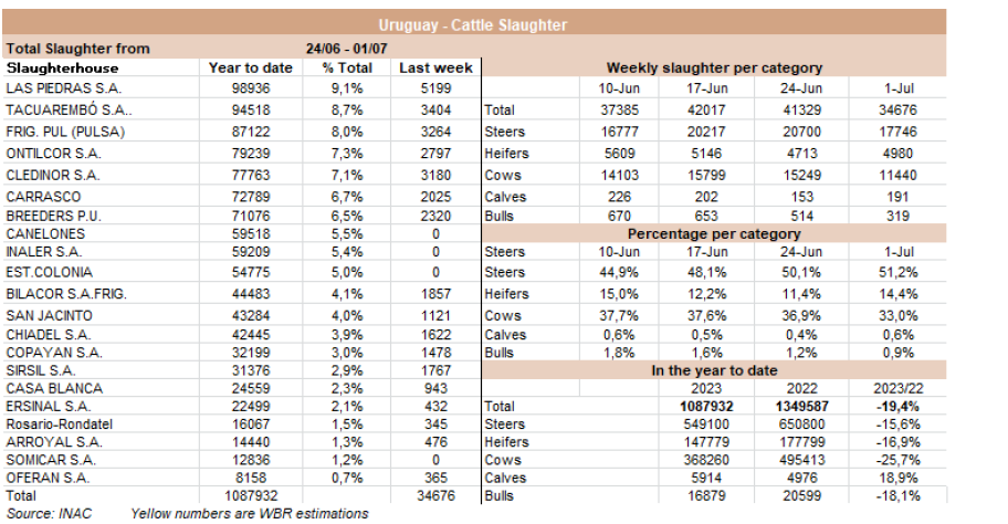 活動(dòng)最多的工廠仍然是拉斯皮德拉斯,有5199頭牛,其次是馬弗里格-塔庫(kù)倫博(3404頭)和米涅瓦-普爾薩(3264頭)。MF只在兩個(gè)工廠工作,屠宰了6,584頭動(dòng)物,而Minerva也在兩個(gè)工廠屠宰了5289頭,因?yàn)?span>Canelones的工人從本周起開始集體休假,上周沒有進(jìn)行屠宰。