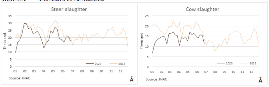 上周牛的屠宰量下降,是4月初復(fù)活節(jié)以來(lái)12周的最低值。INAC報(bào)告說(shuō),屠宰了34,676頭牛,比前一個(gè)星期少了6,653頭(-16%),比去年同期的近40,000頭少了13%。