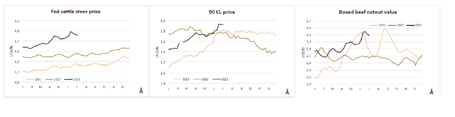在2023年上半年,巴西出口了88.3萬(wàn)噸牛肉,平均價(jià)值為每噸4928美元,年出口量下降了5.3%,平均價(jià)值下降了18.3%。豬肉和雞肉的出口每年分別增長(zhǎng)15%和10%。