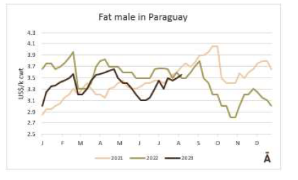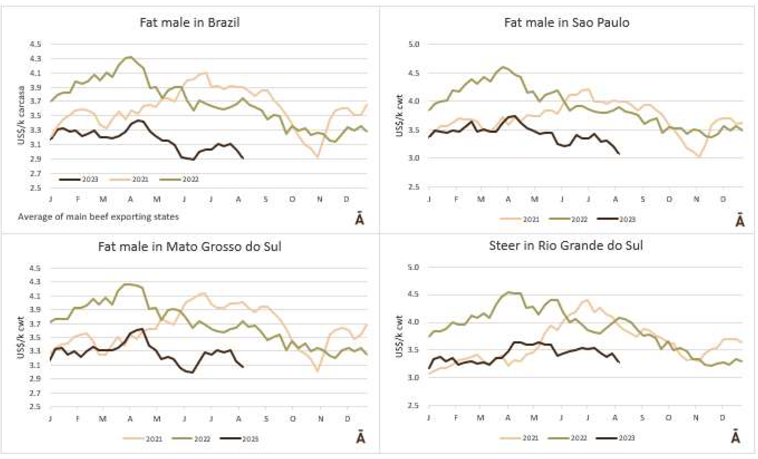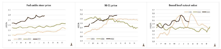 在阿根廷,價(jià)格繼續(xù)迅速上升??紤]官方匯率并增加9%的牛肉出口稅,本周出口公牛增加了26美分,上兩周增加了77美分,每公斤胴體重量為4.56美元。