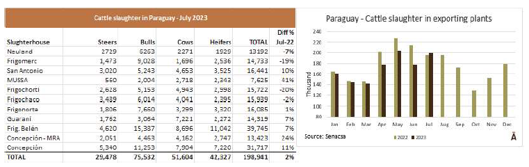 巴拉圭上半年的牛屠宰量月同比都低于2022年,下半年開(kāi)始有所好轉(zhuǎn)。Senacsa報(bào)告稱,近19.9萬(wàn)頭牛進(jìn)入屠宰場(chǎng),比2022年7月多了近4000頭。良好的天氣和飼料條件可能會(huì)加快屠宰速度,因此下半年的屠宰動(dòng)態(tài)可能會(huì)高于2022年。最大的屠宰廠集團(tuán)Minerva,在四家屠宰廠加工了78544頭牛(占總數(shù)的39%),而管理三家屠宰廠的Concepcion集團(tuán)屠宰了61225頭牛(31%)。
