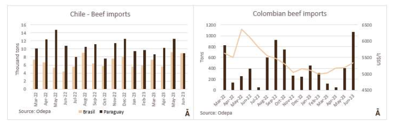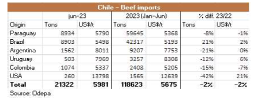 由于智利牛肉進(jìn)口牛價(jià)格的下降,巴西牛肉在國(guó)際市場(chǎng)上表現(xiàn)出競(jìng)爭(zhēng)力。根據(jù)Odepa的數(shù)據(jù),6月份,8903噸巴西牛肉抵達(dá)智利,這是今年迄今為止的最高月度產(chǎn)量,與巴拉圭的牛肉數(shù)量持平。來(lái)自哥倫比亞的牛肉量也大幅增加,達(dá)到1074噸,是過(guò)去至少兩年來(lái)的最高出口量。2023年上半年,智利進(jìn)口了59645噸牛肉,比2022年同期減少了8%。
