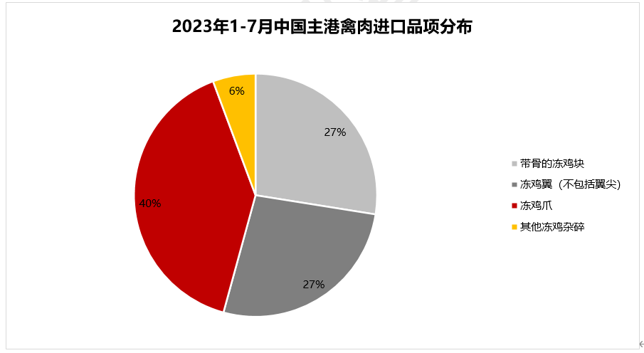 20237月中國主港進(jìn)口禽肉數(shù)量11.58萬噸,環(huán)比減少16%,同比增長24%。進(jìn)口金額3.76億美元,環(huán)比下滑15%,同比上漲4%。1-7月,中國主港進(jìn)口禽肉共計(jì)81.53萬噸,同比增長35%。進(jìn)口總額26.36億美元,同比增長32%。從進(jìn)口國別看,1-7月,從巴西進(jìn)口禽肉41.83萬噸,同比增長74%,占比51%。從美國進(jìn)口禽肉15.73萬噸,同比減少3%,占比19%。從俄羅斯進(jìn)口禽肉7.69萬噸,同比增長6%,占比9%。從泰國進(jìn)口禽肉6.54萬噸,同比增長79%,占比8%。從進(jìn)口品項(xiàng)看,凍雞爪進(jìn)口總量32.67萬噸,占比40%。帶骨的凍雞塊進(jìn)口總量22.454萬噸,占比27%。凍雞翼(不包括翼尖)進(jìn)口總量21.80萬噸,占比27%。其他凍雞雜碎進(jìn)口總量4.64萬噸,占比6%。
