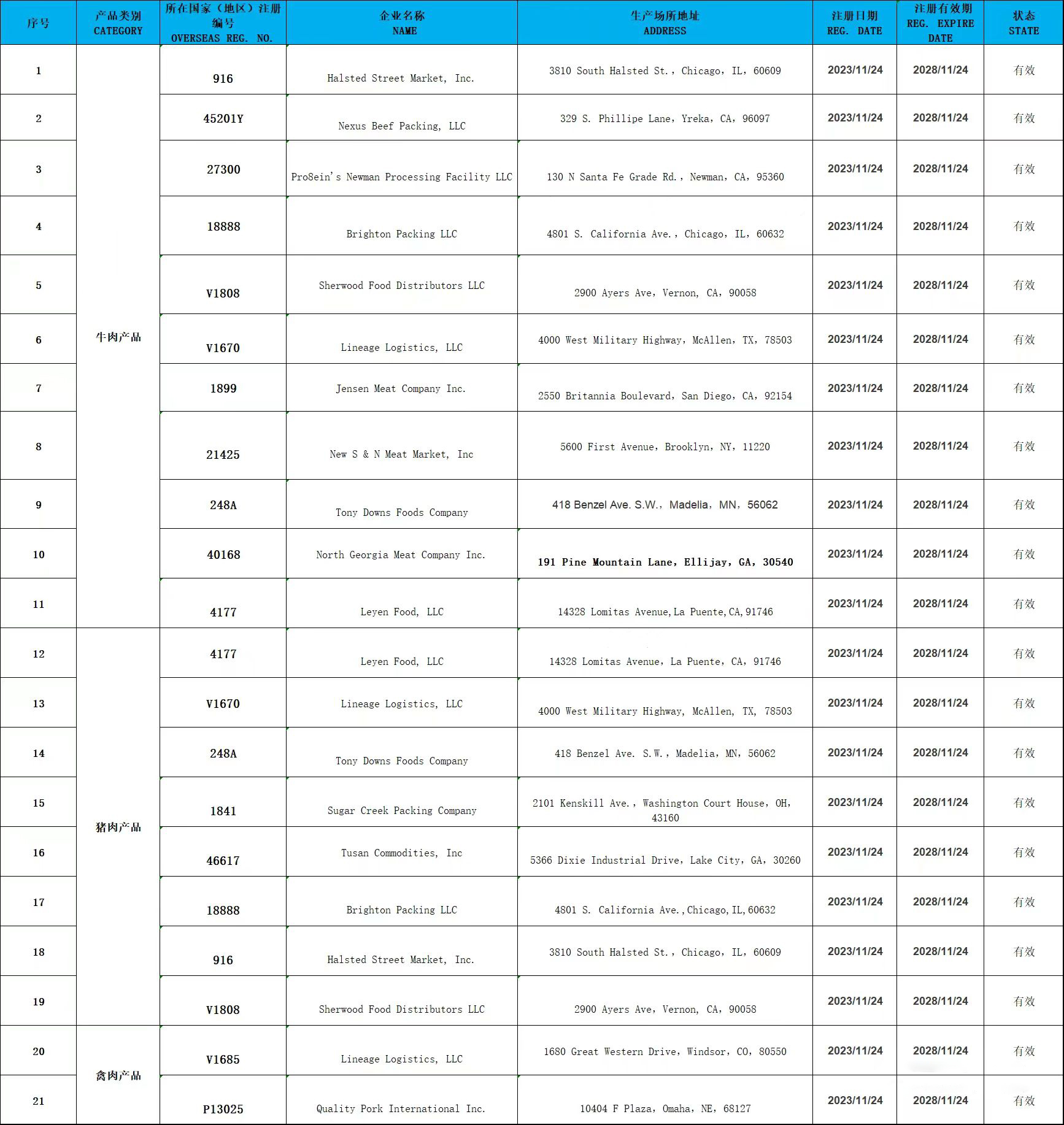 2023年11月24日美國新增21家肉類工廠獲準(zhǔn)輸華?。ㄅH?1家、豬肉8家、禽肉2家)