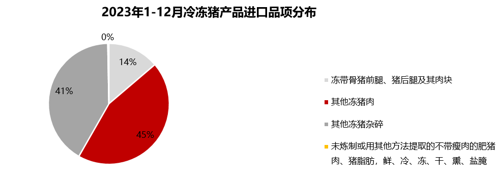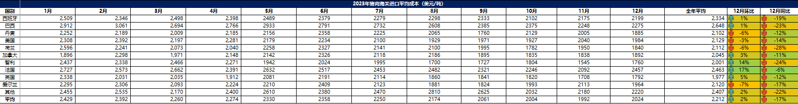 2023 12中國主港豬肉進口量17.7噸,環(huán)比下降4%,同比減少41%。1-12主港豬肉進口量 264.42萬噸,同比下降5%。從進口國別看,其中,從西班牙進口豬肉共計60.27萬噸,同比減少12.9%,占比 23%。從美國進口豬肉共計42.49萬噸,同比增加9%,占比 9%。從巴西進口豬肉共計42.23萬噸,同比持平,占比 16%。從丹麥進口豬肉共計 23.45萬噸,同比減少33%。從進口品項看,1-12,凍帶骨豬前腿、豬后腿及其肉塊進口量 36.41萬噸,占比 14%。其他凍豬肉進口量117.62萬噸,占比 45%。其他凍豬雜碎109.6萬噸,占比 41%。豬油脂類進口量僅 0.78萬噸。從 進口金額看,1-12,主港豬肉進口總額 62.35億美金,同比下降 5%。其中,進口西班牙 豬肉金額 14.8億美金,同比下降12%。進口巴西豬肉金額10.77億美金,同比持平。進口美國豬肉金額 10.04億美金,同比上漲27%。進口丹麥豬肉金額 5.56億美金,同比減少44%。