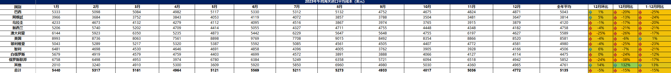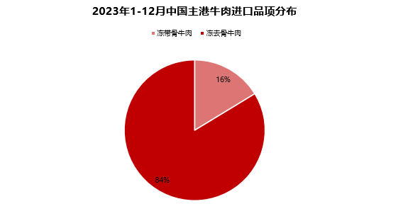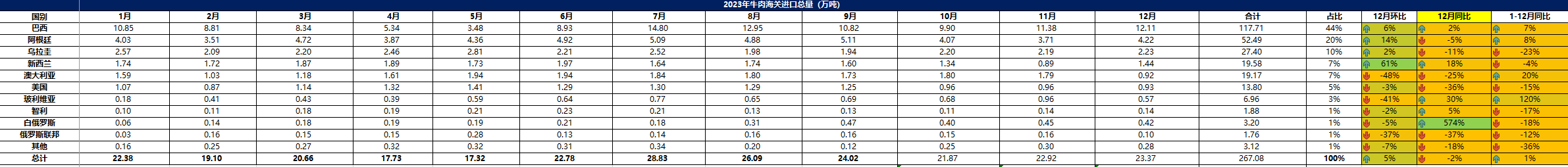 2023 12中國主港牛肉進口量23.37萬噸,環(huán)比上升6%,同比上漲2%。1-12, 中國主港牛肉進口總量 267.08萬噸,同比下降 2%。從進口國別看,進口巴西牛肉 117.7 噸,同比上漲7%,占比 44%。進口阿根廷牛肉52.49萬噸,同比增加 8%,占比 20% 進口烏拉圭牛肉27.4萬噸,同比減少23%,占比 10%。進口新西蘭牛肉 19.58萬噸,同比下降4%,占比 7%。進口澳大利亞牛肉 19.17萬噸,同比增加 20%,占比 7%。從進口品項看,凍去骨牛肉進口總量223.55萬噸,占比 84%。凍帶骨牛肉進口總量 43.51萬噸,占比 16%。從進口金額看,1-12,中國主港牛肉進口金額共計 1347.5億美金,同比減少 18%。 其中,巴西牛肉進口金額597.2億美金,同比下降18%。阿根廷牛肉進口金額216.17億美金, 同比減少 17%。澳大利亞牛肉進口金額126.7億美金,同比增加 7%。烏拉圭牛肉進口金額109.37 億美金,同比減少 39%。新西蘭牛肉進口金額98億美金,同比減少25%。