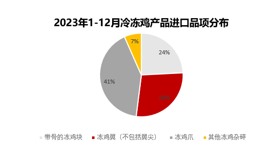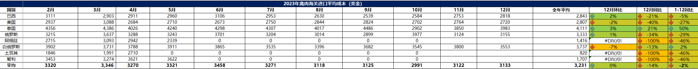 2023 12中國主港禽肉進口量 8.42萬噸,環(huán)比下降13%,同比下降8%。1-12,中國主港禽肉進口量128.09萬噸,同比增加 21%。從進口國別看,進口巴西禽肉共計 67.72萬噸,同比增加 63%,占比 53%。進口美國禽肉 4.32萬噸,同比減少 3%,占比 19%。進口俄羅斯禽肉 12.68萬噸,同比上漲53%,占比 10%。進口泰國禽肉11.61萬噸,同比增下降8%,占比 9%。從進口品項看,帶骨凍雞塊進口量30.99萬噸,占比 24%。凍雞翼(不包括翼尖)35.62 萬噸,占比 28%。凍雞爪進口量52.99萬噸,占比 41%。其他凍雞雜碎進口量 8.51萬噸,占比 7%。從進口金額看,1-12,中國主港肉進口金額共計412.3億美金,同比增 7%。其中,巴西禽肉進口金額194.4億美金,同比增加45%。美國禽肉進口金額 79.8億美金,同比下滑 30%。泰國禽肉進口金額51.4億美元,同比增加 35%。俄羅斯禽肉進口金額 43.1億美金,同比增加14%。白俄羅斯禽肉進口金額 27.7 億美金,同比增33%。