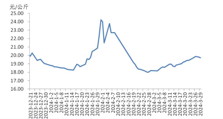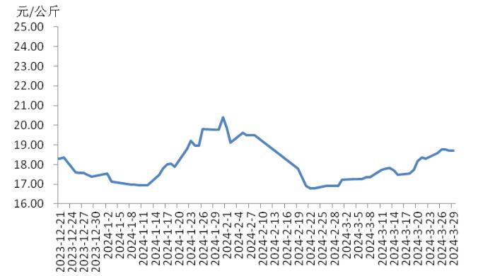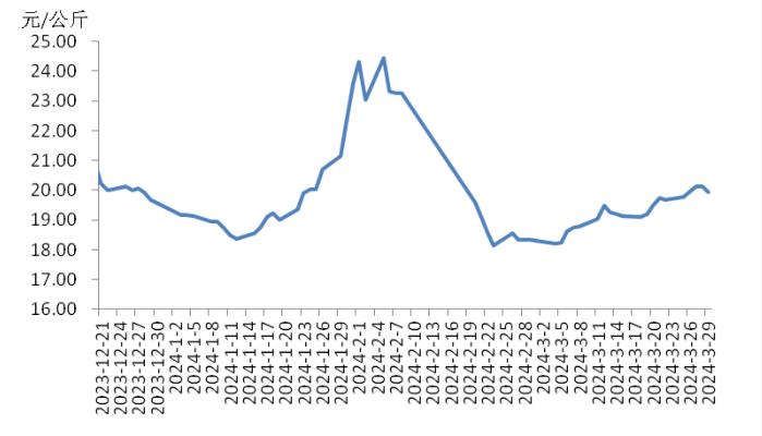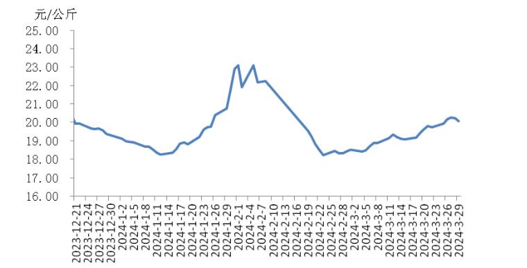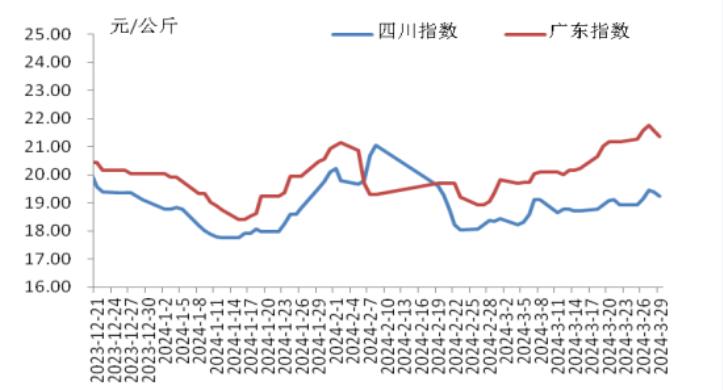 本周,四川豬肉周均價為每公斤19.24元,環(huán)比上漲1.5%,同比上漲5.9%,同比漲幅擴大3.7個百分點。周前期,川內(nèi)散養(yǎng)戶出欄生豬的節(jié)奏較穩(wěn)定,但豬源外調(diào)出川的數(shù)量增多,使得川內(nèi)生豬及豬肉供應(yīng)偏緊,疊加豬肉經(jīng)銷商積極采購,推動豬肉價格上漲。周后期,消費市場對高價豬肉需求量減少,客戶訂單量減少,豬肉價格小幅回落??傮w看,本周四川地區(qū)豬肉周均價環(huán)比小幅上漲。