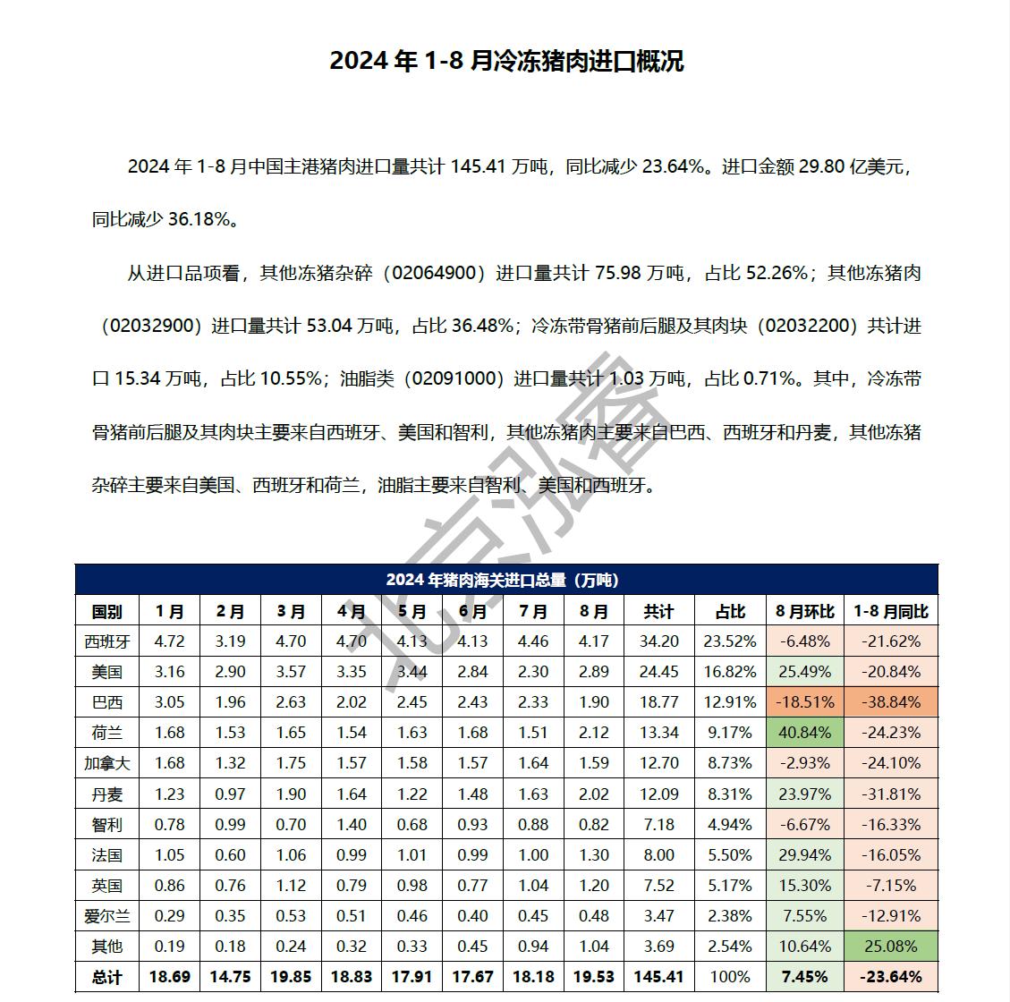 2024年1-8月冷凍豬牛禽肉海關(guān)進(jìn)口數(shù)據(jù)
