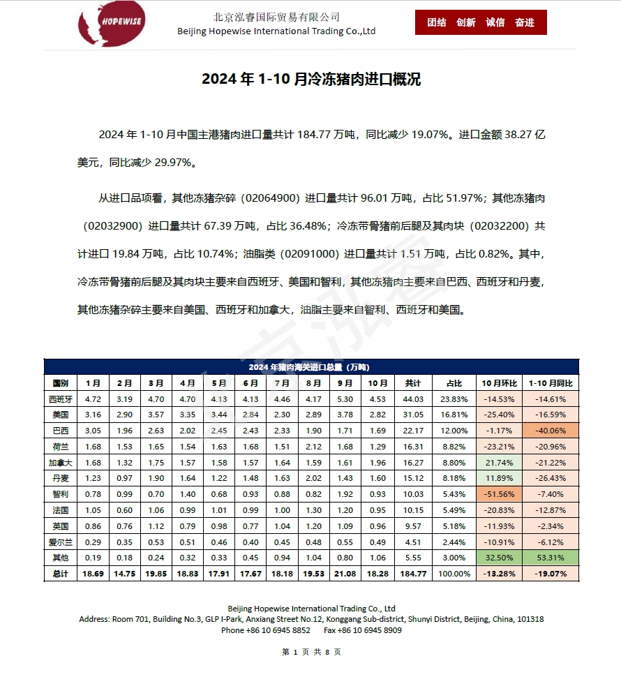 2024年1-10月冷凍豬牛禽肉海關(guān)進(jìn)口數(shù)據(jù)