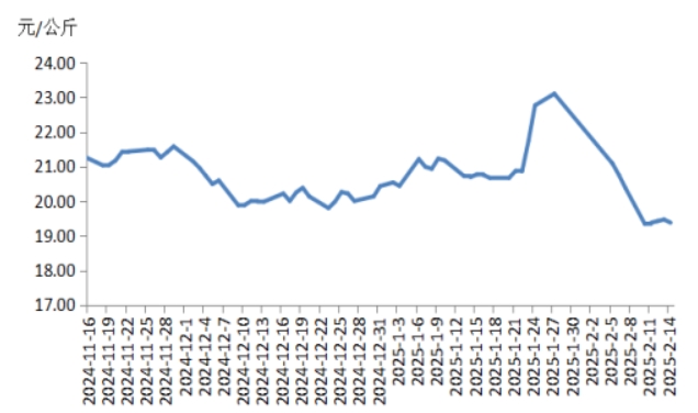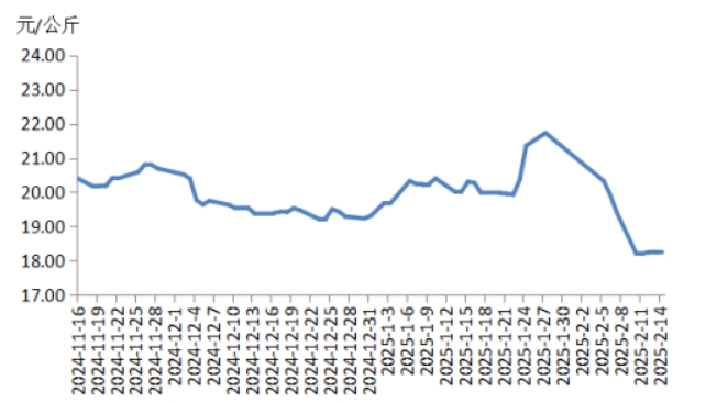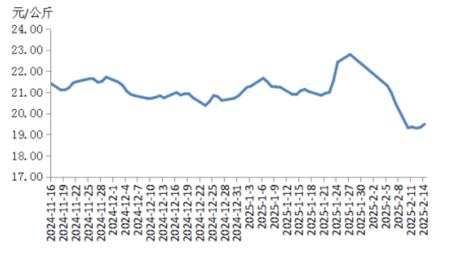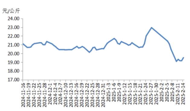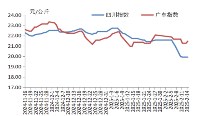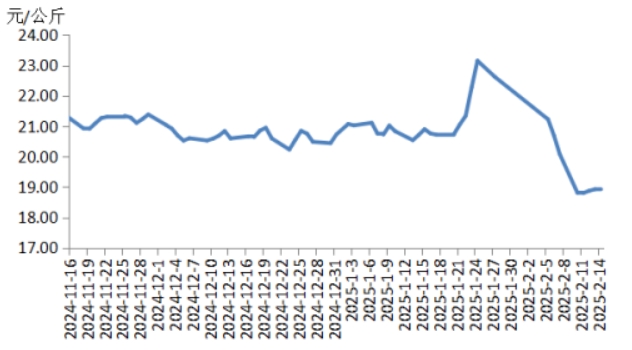 本周華中地區(qū)豬肉價格環(huán)比明顯下跌,周內(nèi)價格先跌后漲。前半周,規(guī)模養(yǎng)殖場的生豬出欄量增加,散養(yǎng)戶將春節(jié)節(jié)前壓欄豬源陸續(xù)釋放,使得生豬及豬肉供應(yīng)充沛,而豬肉消費表現(xiàn)一般,元宵節(jié)提振力度較弱,致使屠宰企業(yè)訂單銷售速度不快,豬肉價格明顯下跌。后半周,各院校開學(xué)后食堂訂單小幅增多,經(jīng)銷商采購積極性增加,帶動豬肉價格有所反彈,幅度有限。總體看,本周華中地區(qū)豬肉周均價明顯低于上周。
