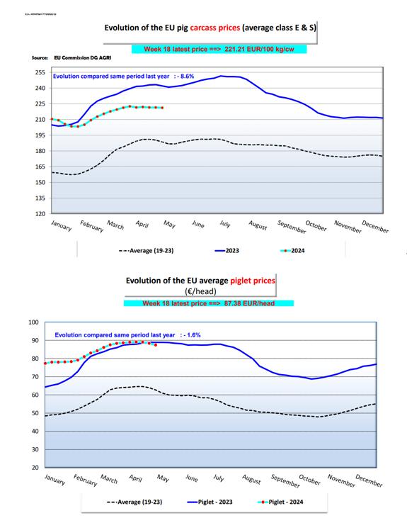 The pork carcass price of EU in week18 was EUR2.21/kg, with down 0.1% compared with week 17, down 0.1% compared with 4 weeks ago and down 8.6% compared with the same term of last year.